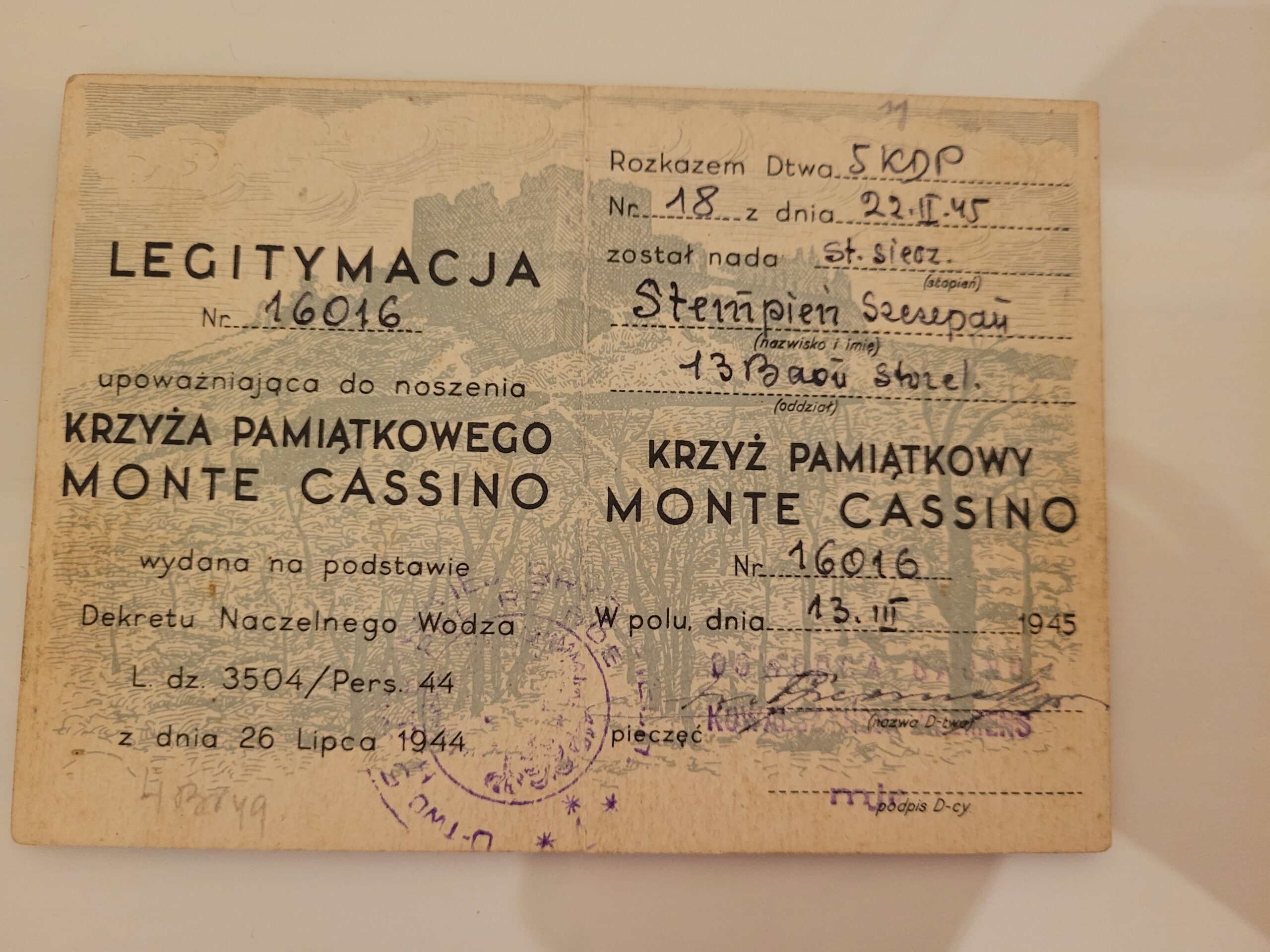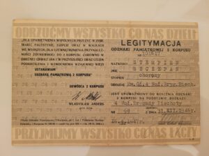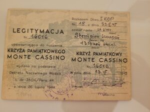 Krzyż Pamiątkowy Monte Cassino (nr 16016), Odznaka Pamiątkowa 2 Korpusu (nr 101617), Pamiątkowa Odznaka 4 Wołyńskiej Brygady Piechoty |