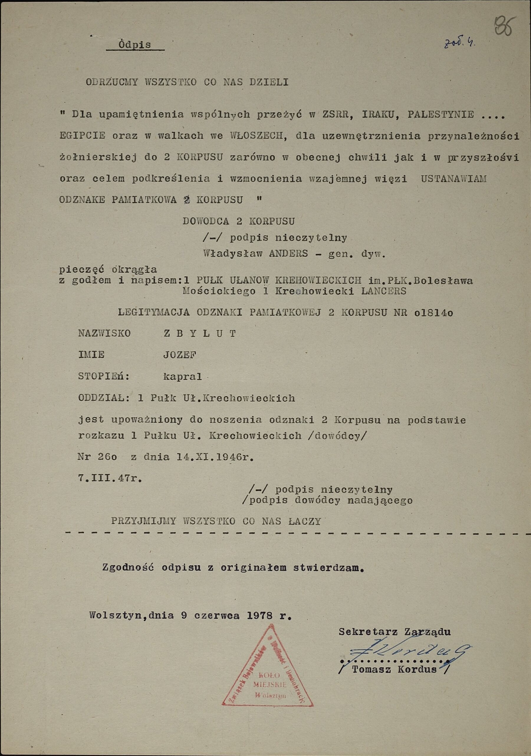 1. Odpis nadania Józefowi Zbylutowi Krzyża Walecznych, 1944 r. |