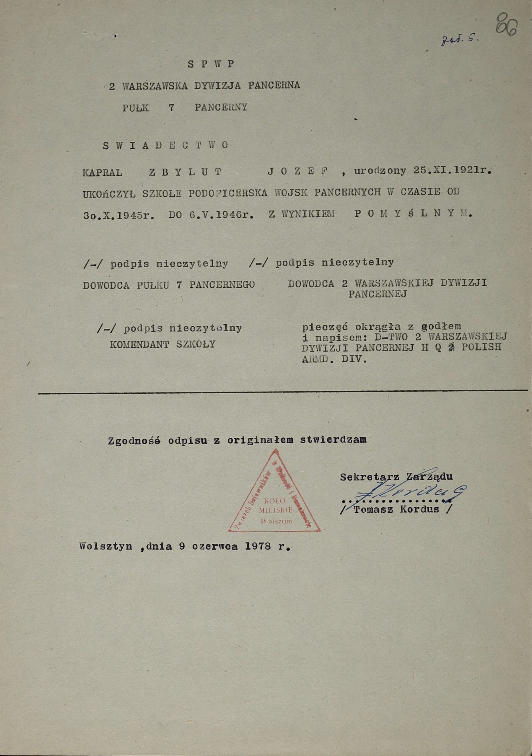 Po uwolnieniu z niewoli sowieckiej na mocy tzw. amnestii w listopadzie 1941 r. wstąpił do tworzonych przez Gen. Andersa Polskich Sił Zbrojnych w ZSRR. Otrzymał przydział do 1 Pułku Ułanów Krechowieckich. Po ewakuacji z ZSRR w 1942 r. na Bliski Wschód i reorganizacji polskich oddziałów pozostał żołnierzem Pułku wchodzącego od tej pory w skład 2 Warszawskiej Dywizji Pancernej 2 Korpusu również dowodzonego przez gen. W. Andersa. St. ułan Józef Zbylut (nr. ewid. 1921/37) po przejściu pełnego szkolenia wojskowego przeszedł cały szlak bojowy w kampanii włoskiej Korpusu wraz ze swoją jednostką. Walczył m.in. w bitwie o Monte Cassino. Udział w walkach zakończył w Bolonii w 1945 r. W trakcie stacjonowania 2 Korpusu we Włoszech do połowy roku 1946 Józef Zbylut ukończył w okresie 30.10.1945 – 06.05.1946 Szkołę Podoficerską Wojsk Pancernych przy Pułku 7 Pancernym 2 Warszawskiej Dywizji Pancernej. |