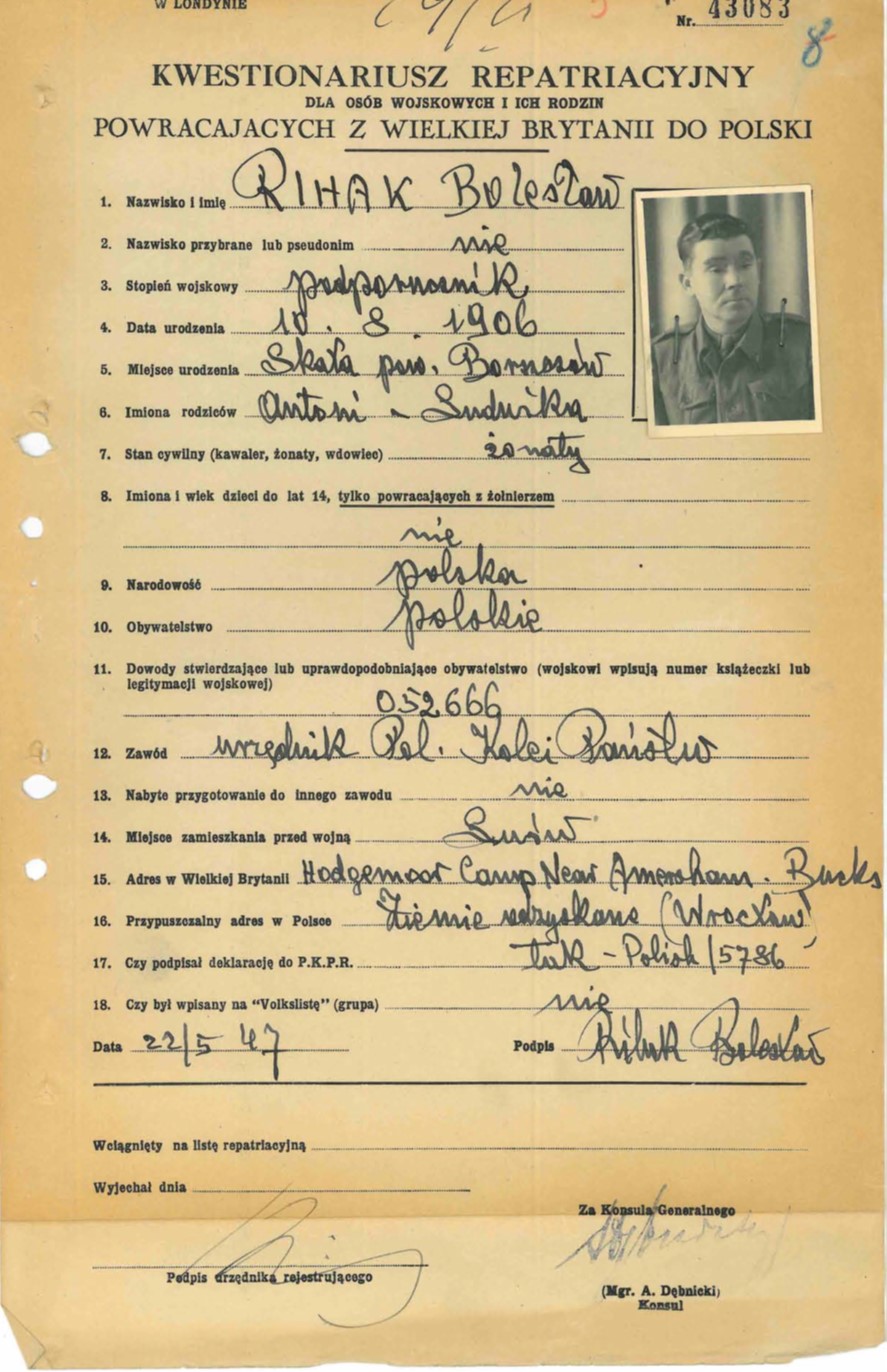 Z dniem 2.02.1947 r. zgłosił się do Polskiego Korpusu Przysposobienia i Rozmieszczenia (nr deklaracji 5786), deklarując powrót do Polski. Od kwietnia do października 1947 r. Bolesław Rihak przebywał w obozach repatriacyjnych w Wielkiej Brytanii (m.in. Hodgemoor Camp koło Amersham na płn-zach od Londynu), oczekując na wyjazd do Polski. 25.10.1947 r. przybył drogą morską z Wielkiej Brytanii do portu w Gdańsku. Początkowo zamieszkał w Międzyrzeczu, skąd wyjechał do rodziny mieszkającej we Wrocławiu. Zmarł we Wrocławiu w 1976 r. |